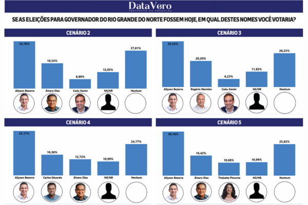 No recorte dos cenários, considerando possíveis definições entre os grupos políticos para o pleito de 2026, o Datavero simulou quatro situações e perguntou ao eleitor “Se as eleições para Governador do Rio Grande do Norte fossem hoje, em qual destes nomes você votaria?”.