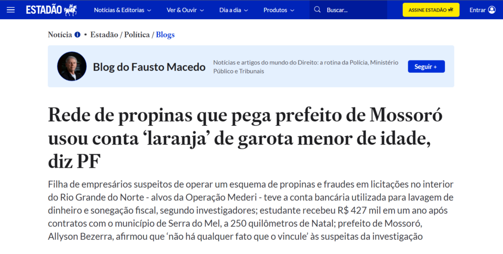 De acordo com a PF, a conta da menor, sem compatibilidade com sua capacidade econômica, recebeu R$ 427 mil em um ano após contratos firmados com o município de Serra do Mel, o que caracteriza, para os investigadores, lavagem de dinheiro e sonegação fiscal. As apurações alcançam municípios como Mossoró, Serra do Mel, Paraú, São Miguel, José da Penha e Tibau, onde empresas teriam simulado concorrência e distribuído propinas.