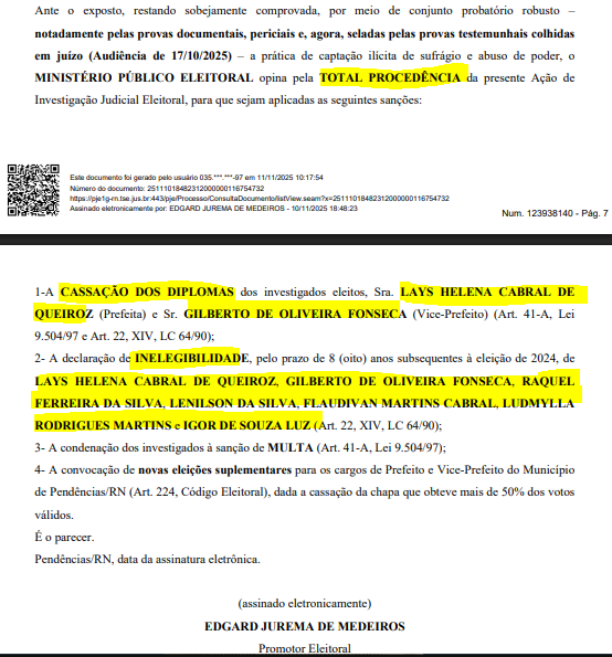 O Ministério Público Eleitoral (MPE) pediu à Justiça a cassação dos diplomas da prefeita de Pendências, Lays Helena Cabral de Queiroz (Republicanos), e do vice-prefeito Gilberto de Oliveira Fonseca, eleitos em 2024. O parecer, assinado pelo promotor Edgard Jurema de Medeiros, aponta fortes indícios de compra de votos e abuso de poder econômico e político durante a campanha.